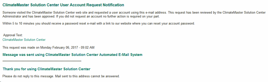 Once the user account administrator has approved the user's account request, the user that requested the account will receive an e-mail from the system informing them that their request of the account has been approved. An example of the e-mail is shown below.
