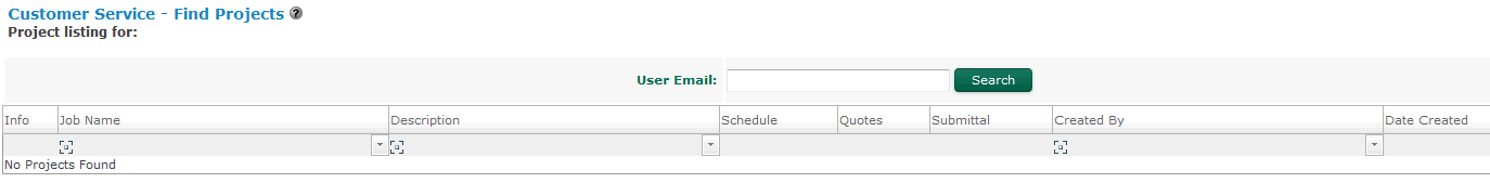From here you can search for projects using the rep's e-mail address. To locate a project enter the user's e-mail address in the User Email text box and click the